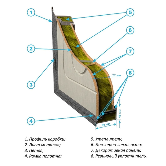 Недорогие двери МДФ оснащены качественными замками российского производства, имеется резиновый контур уплотнения. Конструкция производится из листов стали в 2 мм. Она усилена ребрами жесткости. Есть также противосъемные блокираторы. Диаметр петель составляет 20 мм.