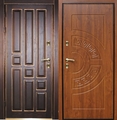Дверь изготовлена из стали толщиной 2 мм, снаружи отделана темной панелью из филенчатого МДФ с окантовкой, внутри – фрезерованная панель из МДФ ПВХ. Установлено три петли диаметром 20 мм и два врезных замка золотого цвета. Модель отлично подойдет для установки в качестве входной двери для загородного дома.