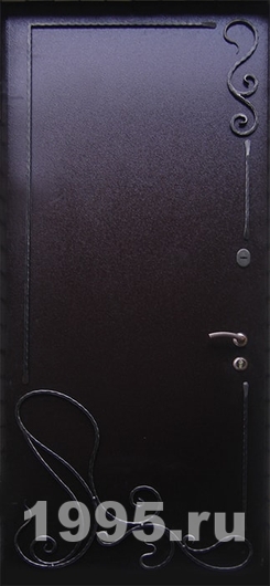 Дверь изготовлена из стали толщиной 2 мм, снаружи и изнутри нанесено порошковое напыление черного цвета с антикоррозийными свойствами. Кованные элементы придают двери изысканный вид. В стандартный вариант комплектации входят два врезных замка с разными механизмами и три петли диаметром 20 мм. Дверной блок оснащен противосъемными блокираторами. Модель подойдет для установки в загородном доме.