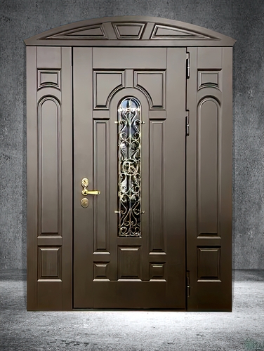 Стальная дверь арочного типа МДФ со вставками, стеклопакетом и решеткой